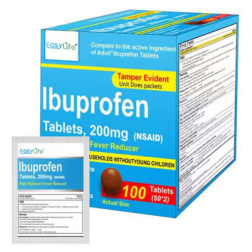 50& 125 count single-use 2 tablet/packets Active Ingredient: ibuprofen 200 mg Pain Reliever and Fever Reducer Easy To Swallow Extra Strenght Pain Reilef