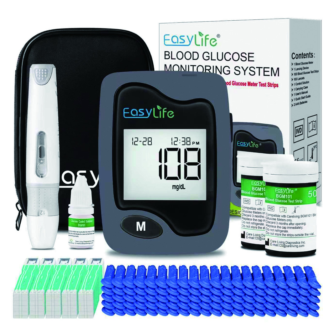 Advanced Glucometer Kit: The Careliving BGM101 Diabetes test kit is equipped with advanced technology to bring more accurate and reliable results and a better experience for your blood sugar control.The Kit includes 1 Blood Sugar Monitor, 100 Test Strips, 100 Lancets, 1 Lancing Device, 1 Control Solution, 1 Product Instruction Manual, 1 Quick Start Guide and 1 Carrying Bag.